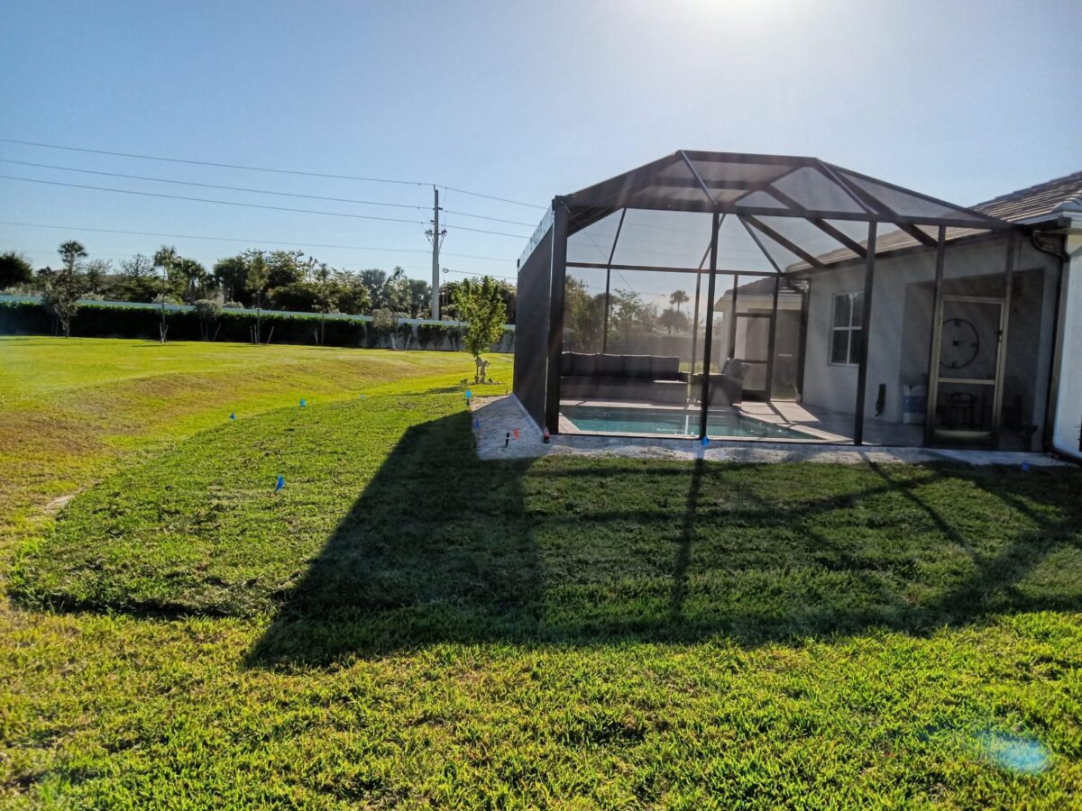 To save the homeowner extra costs, we carefully preserved a narrow strip of existing sod along the side where machine operators had straddled it, requiring only a minor patch job. We then installed several pallets of St. Augustine Floratam sod to rejuvenate the front and back yards. The result? A beautifully restored lawn, perfectly complementing the new pool and landscaping for the homeowner to enjoy.